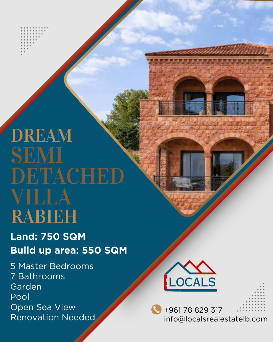 Semi Detached Villa 750 SQM land & 500 SQM built-up area For Sale – Rabieh